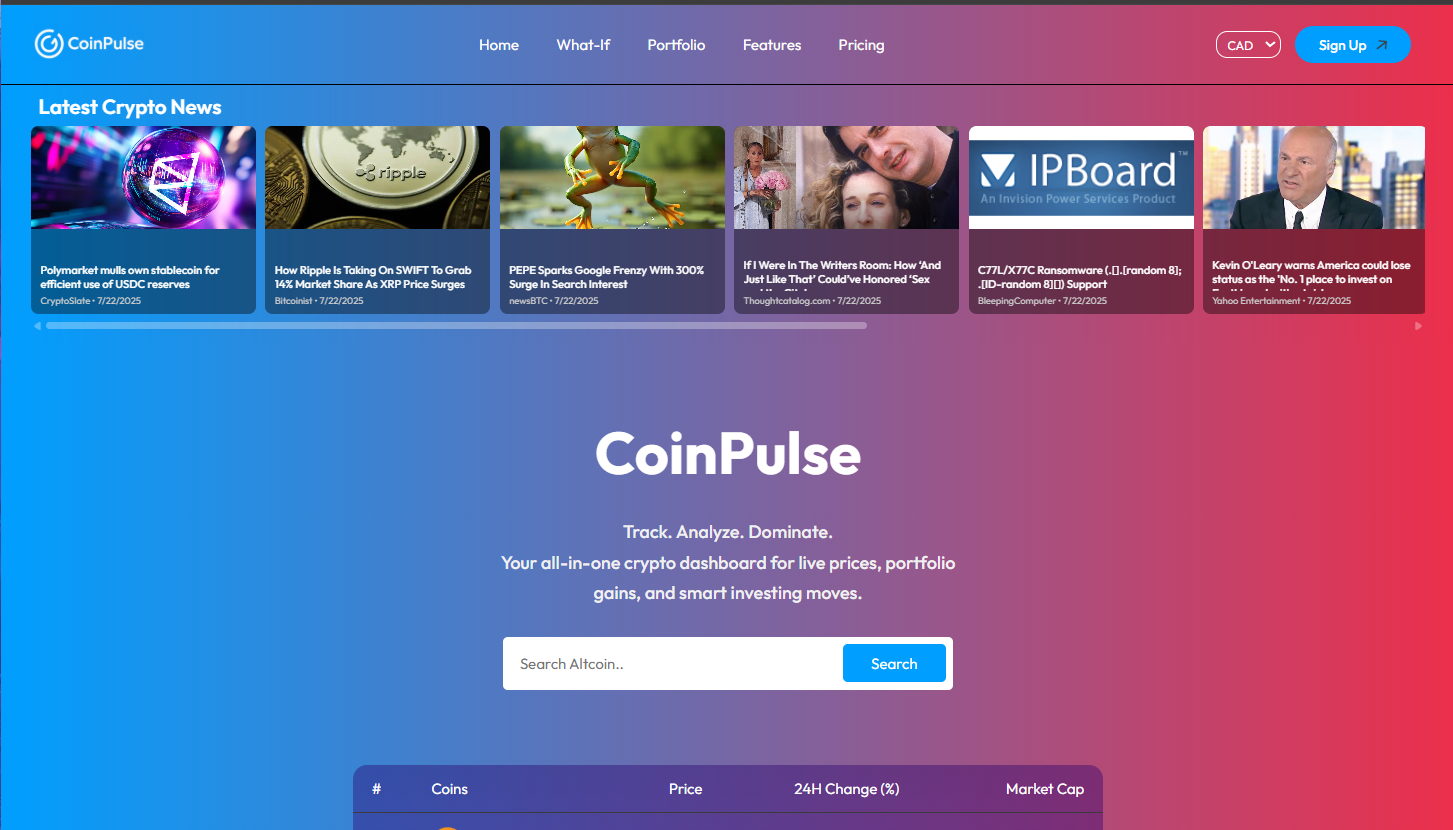 CoinPulse is a dynamic crypto dashboard that uses real-time data from CoinGecko and NewsCatcher APIs. It lets users track top coins, create personalized portfolios, view PnL, and stay updated with live news. With Firebase Firestore for secure storage and visual tools like charts and graphs, it’s a complete solution for crypto analysis and investing.